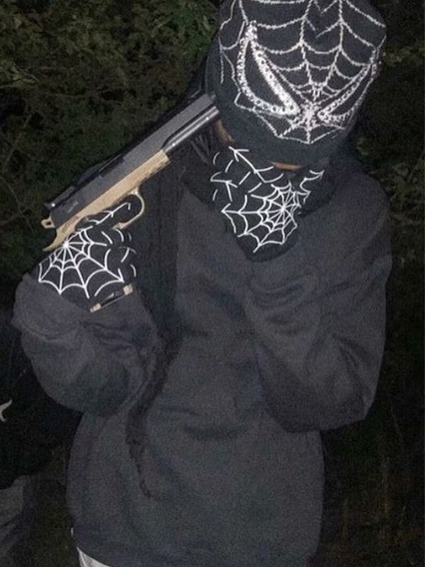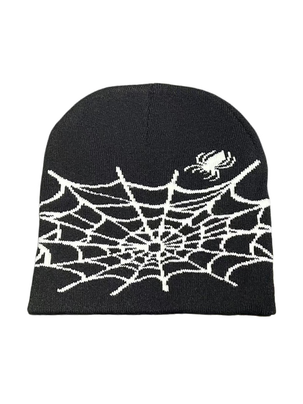 Beanie-Mütze mit Spinnennetz-Print und Strassverzierung