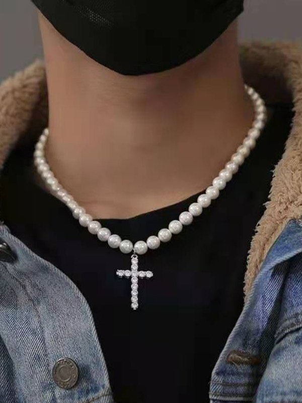 Herren Strass Kreuz Anhänger Faux Perlenkette