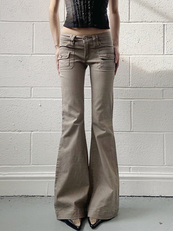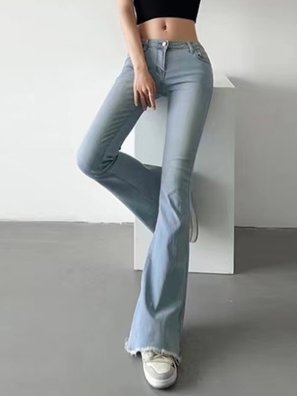 Gewaschene, dehnbare, ausgestellte Jeans mit niedrigem Bund