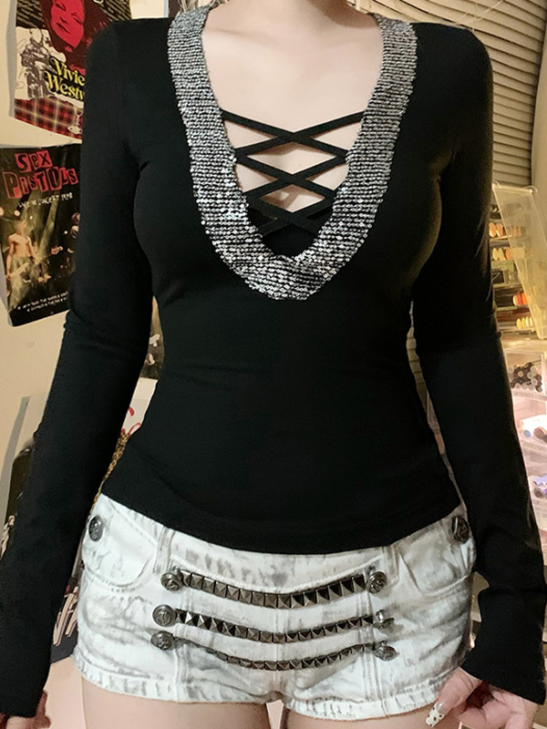 T-Shirt mit V-Ausschnitt und langen Ärmeln