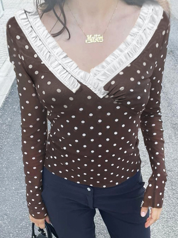 Langärmliges T-Shirt mit gekreuztem Ausschnitt und Punktemuster